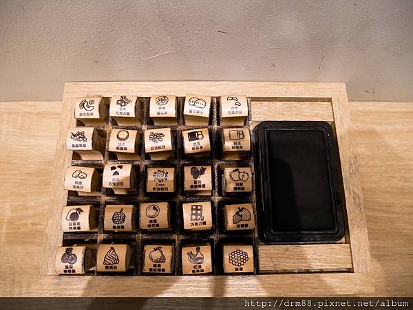 這裡有所有配料的章,先看自己要吃什麼,再來找這個配料章蓋上,