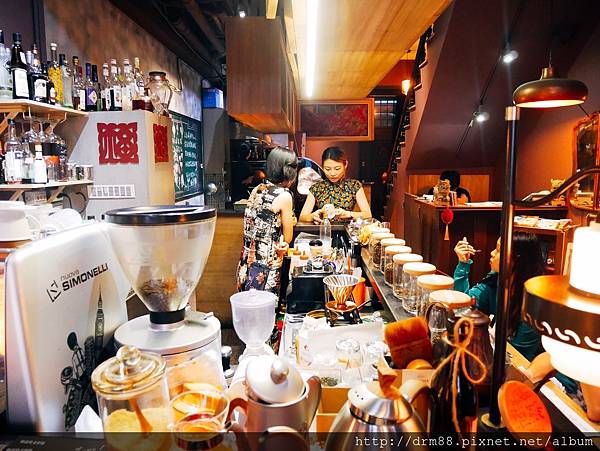 瑪姬坐在一樓吧台邊,喝著咖啡,往前看,兩位美眉在吧台工作,